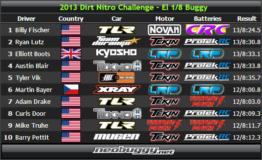 Ty Tessman il ragazzino prodigio si aggiudica il prestigioso titolo portando il suo HB sul gradino più alto del podio spazzando via i titani costretti alla sua rincorsa! Continua la imbarazzante storia della HB che riesce a portare sempre al top i suoi prodotti con soltantoprincipalmente due soli piloti ma due alieni del calibro di Hara e del ragazzino in quextione...non c'è nulla da fare sta diventando leggenda! Bene anche Kyosho e l'immancabile AE!! Ottimo anche per il TLR che riesce a piazzare ben 4 8T nella finale con piazzamenti subito sotto il podio!! Unica pecca l'assenza in finale del fenomeno Phend...ti adpettiamo per la finale buggy!
