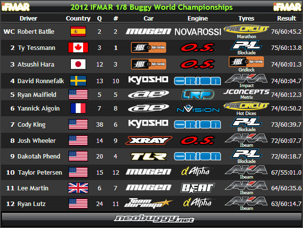 Gli americani a questo giro sono arrivati dietro, la nuova MBX7 è campione del mondo e ben 2 no ragazzi dico 2 HB come per magia salgono sul podio!!! Dico come per magia perchè non sono queste grandi macchine ma nelle mani dei loro 2 big arrivano sul podio delle più grandi competizioni (vedi ROAR 2012 titolo buggy/truggy) .