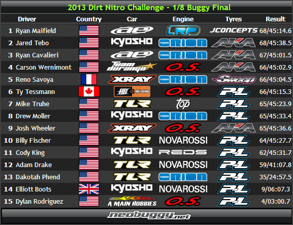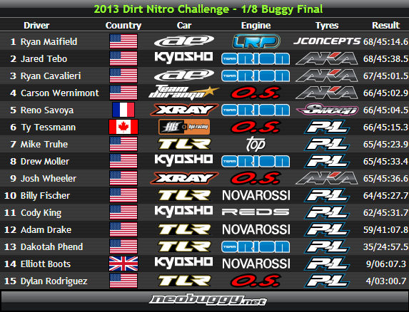 Qualche post fa quando ho stilato un resoconto dei marchi andati in finale Nio mi faceva notare che mancava la A-mainhobbies di Rodriguez, così io sono andato a controllare nella classifica e non vedo Rodriguez. Lo faccio presente a NIo e finisce lì. Oggi mi è venuto un flash ricordandomi che Rodriguez era entrato effettivamente in finale, me lo sono ricordato perchè il pilota aveva abbondonato la gara dopo soli 3 minuti dal via causa rottura. Ricontrollando infatti aveva ragione Nio, Rodriguez c'era eccome in finale solo che era diventato nel grafico riportato da neobuggy un pilota TLR . Quindi nella finale non ci sono state 5 TLR ma 4 più una Amainhobbies! A meno che Rodriguez non abbia corso davvero con una TLR perchè Amainhobbies è un distributore e rivenditore non un marchio che produce macchine!!! Ecco allegati i due grafici della stessa finale...fenomeni paranormali!!!