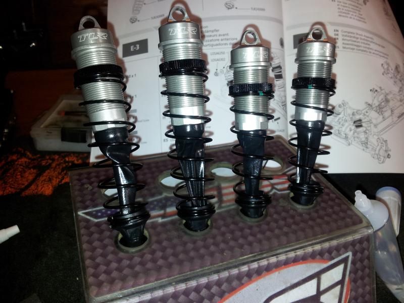 Eccoci drivers al montaggio di una delle parti più importanti del modello: gli ammortizzatori!! TLR anche questa volta ha fatto le cose davvero al top, non solo ovviamente a livello di design (quei tappi con il logo sopra sono stupendi) ma anche in fatto di funzionalità. Il manuale vi offrirà una intuitissima guida per il corretto montaggio, seguite sempre il consiglio up-down per 8 volte e lasciate riposare come in foto fino a chè tutte le bollicine d'aria siano scomparse. Altra cosa di fondamentale importanza: date la stessa identica pressione di ritorno alla coppia di ammortizzatori, sono queste le cose che andranno a fare la differenza, il rebound è la base per avere il giusto comportamento della macchina in pista, soprattutto nelle nostre piste che sono un pò più bucate delle altre in Europa, poi non vi lamentate se la macchina vi saltella come un panchetto! Noterete che questi nuovi corpi ammortizzatori hanno una cassa ed un sitema di pressione davvero valido, avrete la possibilità di creare il vostro rebound di qualsiasi percentuale. Quando andrete ad inserire i copri stelo ricordatevi di metterci dentro un filo di olio (quello per ammortizzatori andrà benissimo) perchè nel bag li troverete appiccicati, lasciate scorrere l'olio al suo interno e poi delicatamente con una chiave non troppo fine li andrete ad aprire, come vedrete in foto. Ricordate anche di segnare le ghiere togliendo un pò di vernice nera, così facendo saprete di quanto avrete aumentato o diminuito la lunghezza dell'ammortizzatore e di quanto siano scesi durante la corsa.