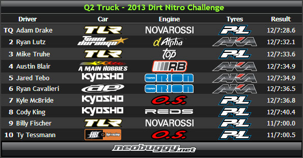 Concluse le prime due qualifiche per la categoria Truck (truggy) Adam Drake con TLR 8T 2.0 è al top della classifica piazzandosi per tutte e due le manche al primo posto... the Drake TQman!!!!! Occhio ai top Kyosho perchè nella seconda ne hanno infilati ben 3!!! Non hanno brillato per quest'ultima i due ragazzini-prodigio Tessman (HB) e Pendh (TLR) ma saranno due protagonisti quando si farà sul serio, quindi seguiteli!!! Bene invece il pilota (a mio avviso) con la guida più spettacolare da vedere: Lutz con il suo cassettone Durango!!! Attendiamo qualcosa in più dai top drivers AE...non si faranno pregare, vedrete!!! Mugen inesistente, vediamo per la cat. buggy se con la 7 qualcuno si farà vedere! Il problema Mugen è anche che non hanno piloti di alto livello a parte ovviamente uno che è l'attuale campione del mondo... è un pò pochino per fare risultati continui, Mugen investite un pò di più taccagni!!!